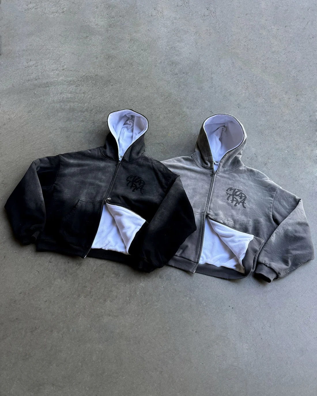 The zip-up design makes it easy to layer and style, whether you’re chilling at home or stepping out in street-ready fashion. With ribbed cuffs, adjustable drawstring hood, and the signature Mertra logo, it’s a versatile essential that works with jeans, joggers, or cargos.
